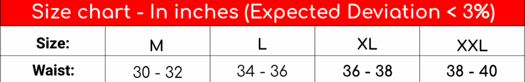 কোমরের সাইজ: * M 30 - 32 InchL 34 - 36 InchXL 36 - 38 InchXXL 38 - 40 Inch